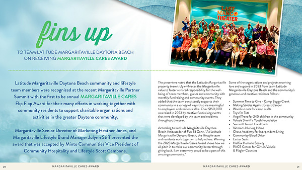 Latitude Margaritaville Daytona Beach community and lifestyle team members were recognized at the recent Margaritaville Partner Summit with the first to be annual MARGARITAVILLE CARES Flip Flop Award for their many efforts in working together with community residents to support charitable organizations and activities in the greater Daytona community .