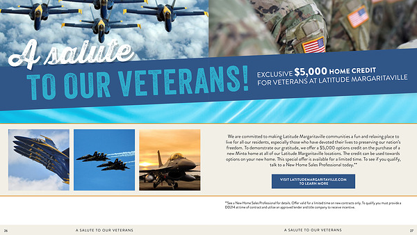 We are committed to making Latitude Margaritaville communities a fun and relaxing place to live for all our residents, especially those who have devoted their lives to preserving our nation’ s freedom. To demonstrate our gratitude, we offer a $ 5,000 options credit on the purchase of a new Minto home at all of our Latitude Margaritaville locations. The credit can be used towards options on your new home. This special offer is available for a limited time. To see if you qualify, talk to a New Home Sales Professional today.**